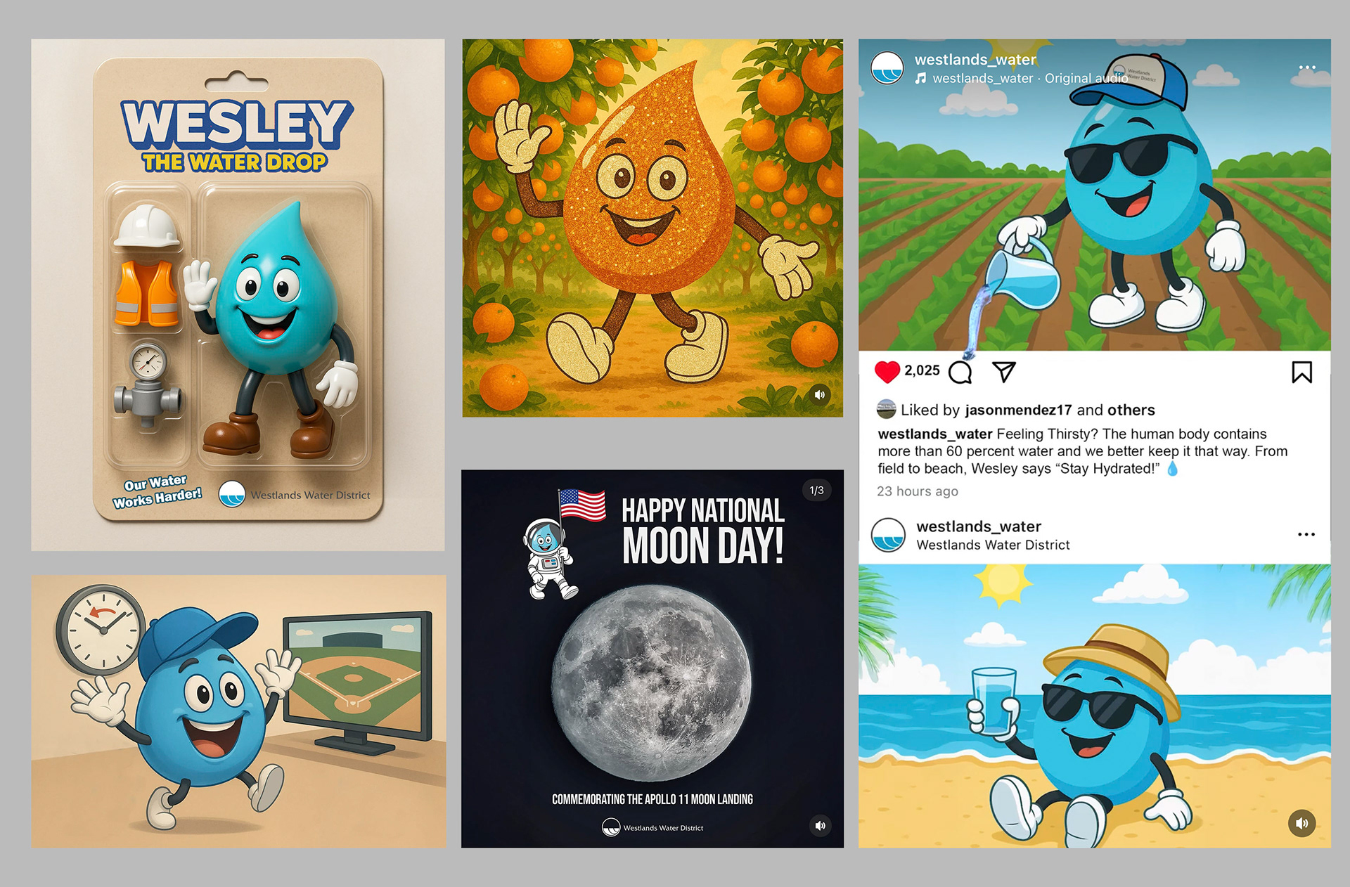 When Clovis Community College became California’s 113th community college, it needed a unified voice that connected its academic and new athletic programs. Working closely with campus leadership, I helped establish a comprehensive brand system that balanced modern design with institutional credibility. From logo treatments and typography to athletics integration and web standards, the guidelines I developed brought visual consistency and pride to a brand still finding its identity. The system remains in use today. That experience became the foundation for how I now approach branding at Westlands Water District where identity extends beyond color and logo into character and story. I designed Wesley the Water Drop, the district’s official mascot, as both an educational ambassador and an expressive visual asset. Wesley’s design system includes a flexible “toolkit”. A base water drop body with interchangeable hands, faces, and gestures that allow him to fit any campaign tone. Whether he’s celebrating conservation, explaining groundwater recharge, or making an appearance as a plush mascot, Wesley represents accessibility, consistency, and creativity. This section reflects my belief that brand guidelines aren’t strict or boring rules, they’re tools for creative continuity. They keep a message consistent while leaving room for character, humor, and human connection. Key roles: Brand architecture, mascot development, visual systems design, identity standards documentation, institutional branding, illustration.